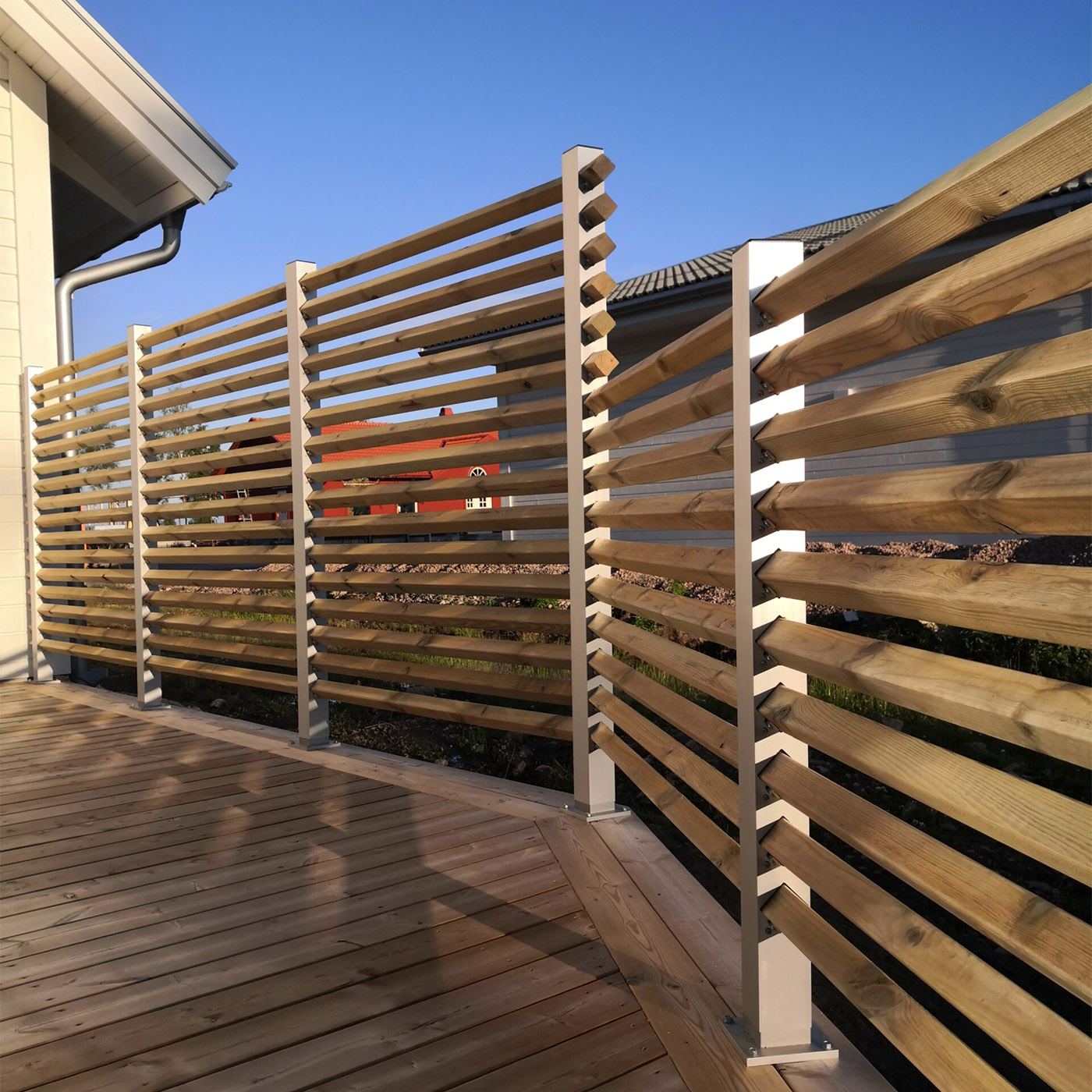 Montera reglarna med hjälp av fästet på baksidan av stolparna och montera alltid staketet så att det blir stabilt – rekommendation är max 150 cm mellan stolparna samt att du alltid placerar ut stolparna innan du skruvar fast virket för att säkerställa att din beställning blev korrekt.